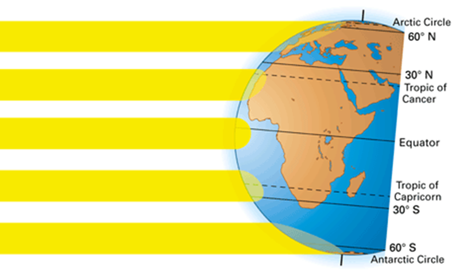 - 위도가 높은 지역은 적도에비해 같은 에너지를 넓은 단면적에 나눠받게 됨.