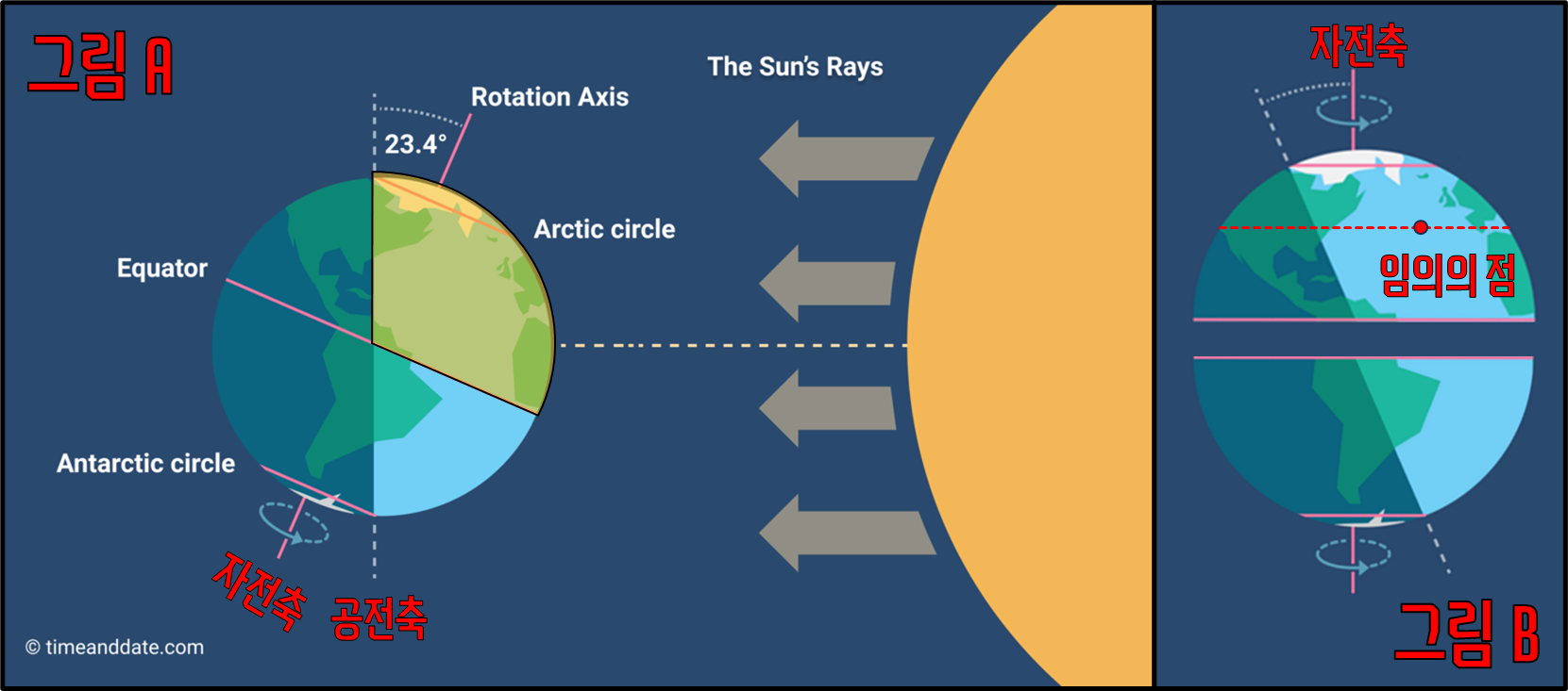 - 그림B는 그림A 상태의 지구의 위상에서 자전축을 수직으로 정렬한 후 북반구와 남반구를 분리한 그림임.