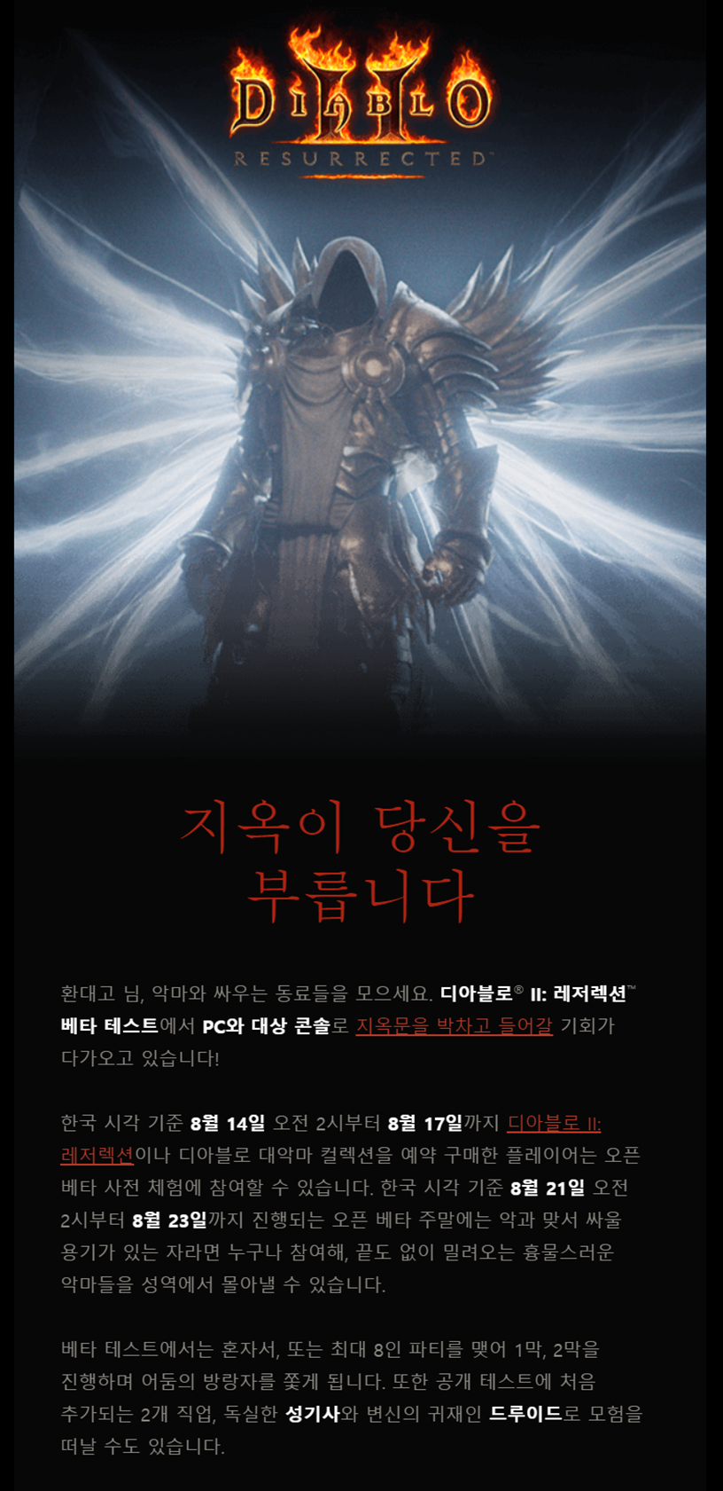 블리자드가 예고했던대로 8월 베타테스트 일정이 공개되었습니다.
