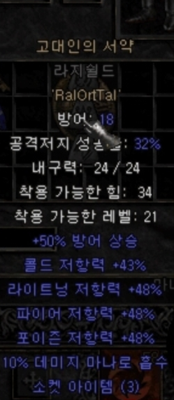 | 초반에 레지 맞추기에 매우 좋은 고대인의 서약입니다. 나이트메어에 접어들면서 훅 떨어지는 레지를 잡아주는 역할로 주로 사용합니다. 재료로 들어가는 방패의 경우 상점에서도 어렵지 않게 구하실 수 있습니다. 구성되는 룬 세트 자체도 드랍이 잘 되는 편이며, 액트5 퀘스트 보상으로도 얻을 수 있습니다. |