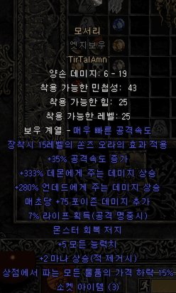 | 아이템 구입가를 낮춰주기 때문에 창고에 박아뒀다가 겜블할때만 꺼내쓰는 용도로 주로 사용되는 모서리입니다. 하지만 맨땅 아마존 플레이어라면 굉장히 매력적인 선택지가 될 수 있습니다. 데몬/언데드 증뎀이 좋고 초반에는 무기 증뎀보다 좋은 속성데미지가 붙어있으며, 기타 옵션도 은근 쏠쏠하기때문에 초반에 만들었다가 의외의 만족감을 느낄 수도 있습니다. 또한 높은 데몬 증뎀과 공격속도를 활용하여 좋은 재료에 작업하면 헬 액트4까지도 커버치는 모습을 보여줍니다. |