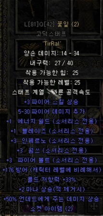 | 5-30 파이어 데미지 추가 +3모든파이어스킬레벨상승 +3파이어볼트(소서리스전용) +3인페르노(소서리스전용) +3웜스(소서리스전용) 적제거시+2마나획득 콜드저항력+33% |