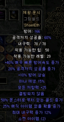 | 20% 블럭율 증가 40%블럭속도증가 모든저항력+25% 마나재생15% 결빙되지않음 50%몬스터로부터얻는골드증가 25%매직찬스증가 |