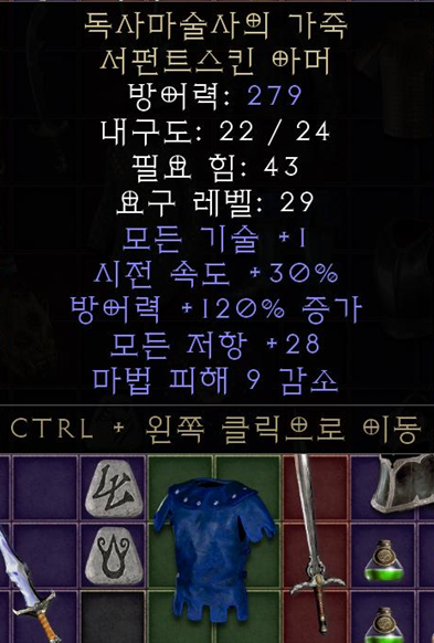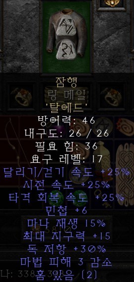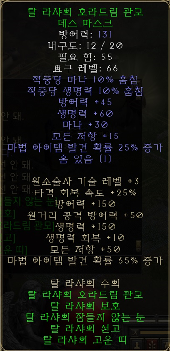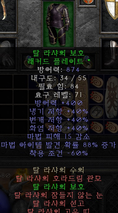 스텔스(룬워드) ▼ 소서교복(유니크) ▼ 탈라샤 갑옷(세트) / 최소 3세트 or 명예의굴레(룬워드) |