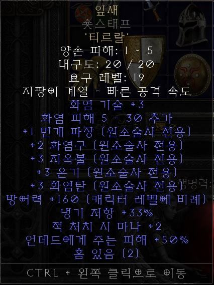 잎새[Leaf, 구: 꽃잎] 렙제 : 19 2소켓 지팡이 / 티르(Tir)+랄(Ral) 초반을 잡아주는 룬워드 스테프 꽃잎입니다. 19렙 이전에는 미리 티르(Tir)룬과 랄(Ral)룬을 준비해 두고 19렙을 찍자마자 상점에서 2소켓 스테프를 구해 작업해줍니다. 꽃잎은 스피리트를 제작하기 전까지 사용하면 됩니다. |