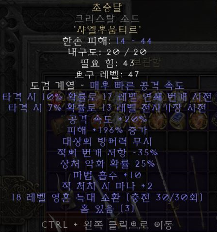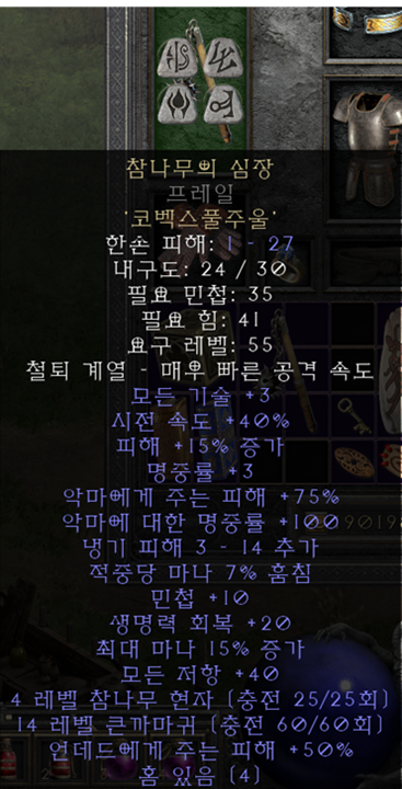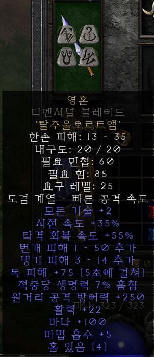 영혼[Spirit, 구: 스피리트/스피릿] 렙제 : 25 4소켓 칼 탈(Tal)+주울(Thul)+오르트(Ort)+앰(Amn) 최소한 신오브를 구하기 전까지 꾸준히 사용할 수 있습니다. 구하기 쉬운 룬들로만 구성되어 있지만, 재료템인 4소켓 크리스탈소드나 브로드소드가 운이 없으면 심하게 안나오기도 합니다. 스피리트의 경우 착용 유무에 따른 사냥의 질 차이가 매우 심한 편이기 때문에 적당히 파밍해도 나오지 않는다면 노말 카우에서 나온 노소켓 크리스탈소드를 라주크에게 가져가 4소켓을 뚫는 것이 오히려 효율적일 수도 있습니다. |