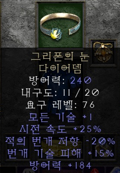 그리폰의 눈(구: 다이어뎀, 다뎀) 체라소서가 사용하는 투구인 다이어뎀입니다. 올스킬/패캐/라깍 구성으로 체라소서에게 필요한 최상급 옵션이 모여있습니다. 체라소서라면 뚜껑은 무조건 다뎀을 목표로 합니다. |