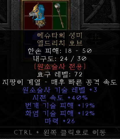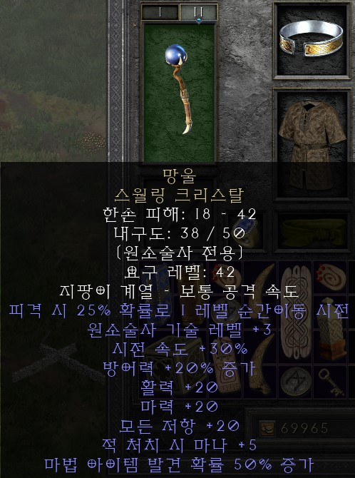 신오브(유니크 스월링크리스탈) 신오브로 잘 알려진 유니크 스월링 크리스탈 유니크입니다. 상위 오브로 엘드리치오브가 있기는 하지만, 변동옵션이 정신병 걸리는 수준이기 때문에 사실상 무기로써의 졸업 상한선은 신오브/오크의심장 정도로 타협하는 게 정신건강에 이롭습니다. 피격시 텔레포트 시전 옵션이 생존에 도움이 되는 경우도 있기는 하지만 내 의지와 상관없이 자꾸 텔레포트가 되는 경우가 많아 스트레스를 받을 수 있습니다. 소켓을 뚫고 아이스트(Ist)룬을 박아 매찬을 올리기도 합니다. |