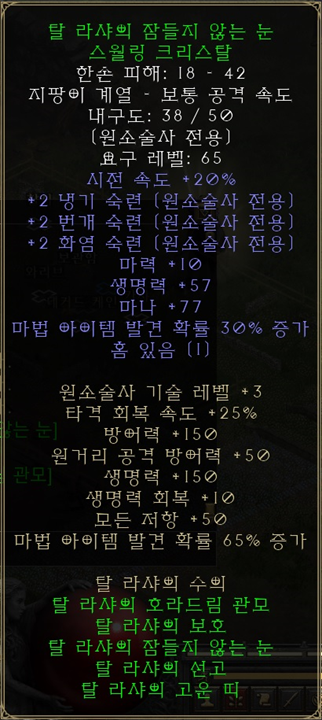 탈봉 / 반드시 풀세트로만 착용 2세트 효과 : +1 소서 올스킬 3세트 효과 : 적의 파이어 레지 -15% 4세트 효과 : 적의 라이트닝 레지 -15% 풀 세트 효과 : 콜드 스킬 데미지 +15% 탈라샤 지팡이의 경우에는 반드시 풀세트일때만 착용합니다. 풀세트 효과를 받지 못하는 상황에서는 신오브나 스피릿에 비해 성능이 너무 안좋습니다. |