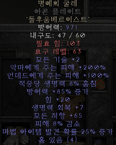 명예의굴레(Chains of Honor) 렙제 : 63 4소켓 갑옷 돌(Dol)+움(Um)+베르(Ber)+아이스트(Ist) 수수께끼가 필요없는 소서리스의 지존갑옷인 명굴입니다. 2스킬/65올레지/20힘/뎀감/25매찬 위에 나열한 옵션만으로 타 갑옷과 비교 자체를 불허합니다. 굳이 따지자면 수수에 비해 낮은 힘이 문제될 수는 있으나 수수와 비교했을 때 빠지는 피를 참으로 매꾼다고 해도 65올레가 있는 명굴쪽이 비교적 우위에 있습니다. |