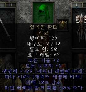 유니크 샤코 두말이 필요 없는 국민 투구인 샤코입니다. 2스킬/뎀감/매찬50의 미친 옵션을 자랑하며, 드랍 난이도도 먹을만한 수준이기 때문에 사실상 종결템이라고 보시면 되겠습니다. |