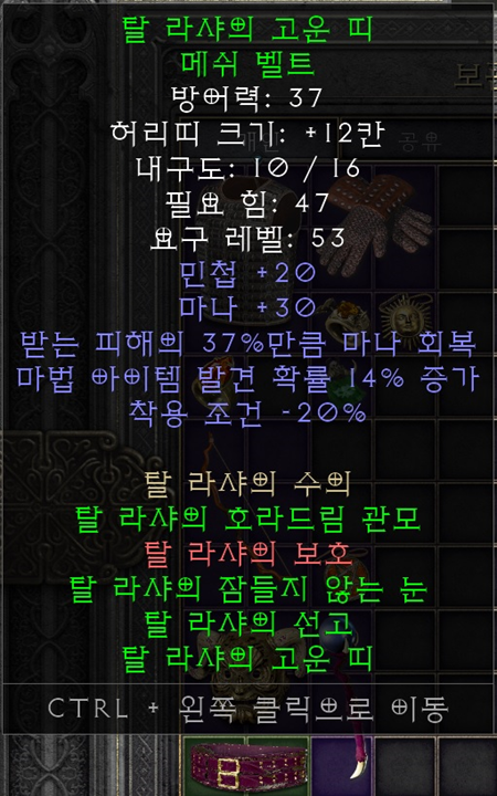 캐스팅 벨트(크래프트) 매직샤크스킨벨트+아이드(Ith)룬+최상급자수정+매직쥬얼 나이트메어에 진입하셨다면, 마을에 있는 기드에게 도박으로 샤크스킨벨트를 구매한 후에 위의 공식을 사용하여 크래프팅하여 캐스터 벨트를 만들어 착용해줍니다. 패캐/마나재생/마나 옵션이 확정으로 붙으며, 추가적으로 1~4개의 옵션이 랜던하게 붙습니다. 크래프팅 옵션은 케릭터레벨과 아이템레벨에 따라 옵션의 품질이 달라지므로 적당한 벨트를 구하지 못했다면 꾸준히 크래프팅하여 착용해주시면 됩니다. |