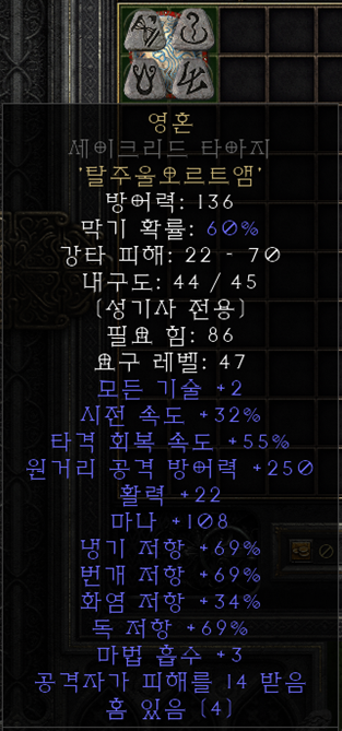 영혼[Spirit, (구)스피리트/스피릿] 렙제 : 25 4소켓 방패 / 탈(Tal)+주울(Thul)+오르트(Ort)+앰(Amn) 팔라딘을 사기로 만드는 요소 중의 하나죠. 모두가 사용하는 룬워드인 스피릿이지만, 팔라딘은 팔라딘 전용 방패에 작업할 수 있다는 말도 안되는 장점이 있습니다. 따라서 타 직업은 모너크의 조건인 힘156/레벨57에 도달해야 스피릿 방패를 낄 수 있는 반면, 팔라는 재료만 구하면 25렙부터 스피릿을 양손에 들 수 있습니다. 사실상 방패로써는 캐스터 졸업 아이템입니다. 35패캐를 맞추는 것을 목표로 꾸준히 재료를 수급해서 작업해주시면 됩니다. 재료로는 모저가 높게 붙은 세이크리드 타아지를 최상급으로 쳐줍니다. |