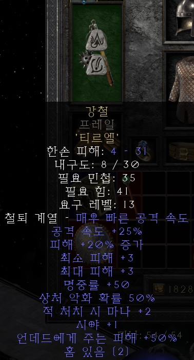 강철[Steel, (구)스틸/강철] 렙제 : 13 2소켓 검·도끼·메이스 / 티르(Tir)+엘(El) 팔라의 초반을 캐리해주는 룬워드 강철/스틸 입니다. 노말 액트2에 진입한 후 하수도 2층 웨이포인트를 개방한 후에 NPC 파라에게 무한 상점노가다를 통해 2소켓 프레일을 구한 후에 작업해줍니다. +2 마나 상승 옵션으로 초반에 열의를 무한난사 할 수 있게 합니다. 본 무기는 24레벨 직전까지 사용하시면 됩니다. |