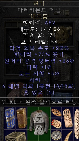 연기(Smoke) 렙제 : 37 2소켓 갑옷 / 네프(Nef)+룸(Lum) 연기의 가장 큰 장점은 쉬운 재료와 높은 올레지입니다. 따라서, 초반에 손쉽게 만들어 사용하실 수 있습니다. 카우를 돌면서 나온 재료에 큐빙으로 구멍을 뚫고 나서 2소켓이 나오면 연기를 만들어 입어보셔도 좋습니다. 하지만, 제가 연기를 초반에 쓰면서 느낀 점이 있는데 높은 레지가 만족스럽기는 하지만, 맞아죽기는 매한가지라는 겁니다. 때문에, 중간에 재료와 상황이 알맞으면 입어주시되, 그냥 스킾하고 다른 갑옷을 만드시는 것도 좋아보입니다. |