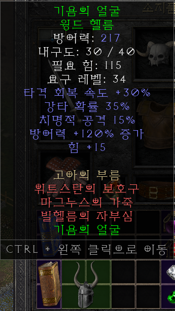 협박[Duress, (구)협박] 렙제 : 47 3소켓 갑옷 / 샤엘(Shael)+우움(Um)+주울(Thul) 슴딘 전용 갑옷인 협박입니다. 강타 옵션이 붙어있어 슴딘이 사용합니다. 강타 옵션 외에도 패힛/방어증가/올레지가 붙어있어 꼭 슴딘이 아니더라도 범용적으로 사용할 수 있습니다. |
