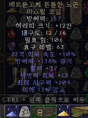 4. 유니크 미스릴코일 슴딘용 벨트로 선정한 유니크 미스릴코일입니다. 전투형 캐릭터에게 좋은 패힛과 뎀감이 붙어있습니다. |