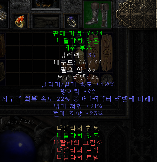 | 부츠에 대해서 정리해보자면 캐스터는 매찬을 위해 배추를, 슴딘은 강타를 위해 고어라이더/고블린토우를 사용하게 됩니다. 하지만 매찬이나 강타에 대한 니즈가 필수적인 것이 아니라면 선택의 폭이 굉장히 넓습니다. 부츠를 통해 취할 수 있는 옵션으로는 달려(필수)/레지/스텟을 기대할 수 있는데, 이러한 니즈를 모두 충족하는 완성형 유니크/세트 부츠는 존재하지 않기 때문에 옵션이 적당히 잘 붙은 레어부츠를 사용하는 것도 방법 중의 하나입니다. 예전에 유행하던 전지현 부츠(30달려/20패힛/17힘/콜저41/라저22/파저35)가 이와같은 부츠의 적합한 예시로 볼 수 있습니다. |