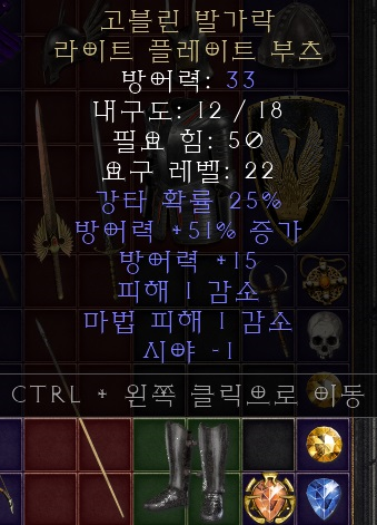 3. 고블린토우(유니크 라이트플레이트부츠) 슴딘용 부츠입니다. 고어라이더와 마찬가지로 강타를 취하기 위해 사용합니다. |