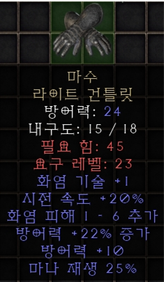 | 팔라딘 장갑의 경우 햄딘은 트랑울장갑 / 슴딘은 뱀파장이라는 명확한 목표가 정해져 있습니다. 특히 캐스팅이 붙은 장갑은 메피장/트랑울장 밖에 없기 때문에 해당 장갑을 구하기 전까지는 레지스트리/스텟을 챙겨줄 수 있는 장갑을 주워서 사용하시면 됩니다. |