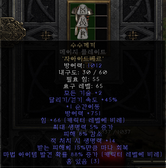 모든 스킬 +2 달리기/걷기 속도 +45% +1 순간이동 방어력 +(750-775) 힘 +1~74(케릭터 레벨에 비례) 최대 생명력 5% 증가 피해 8% 감소 적 처치 시 생명력 +14 받는 피해의 15%만큼 마나 회복 마법 아이템 발견 확률 88% 증가(케릭터 레벨에 비례) |