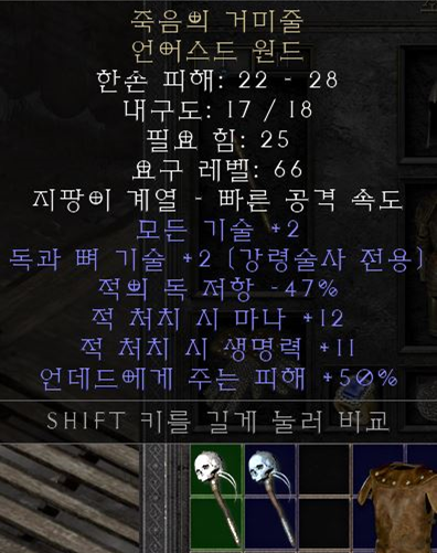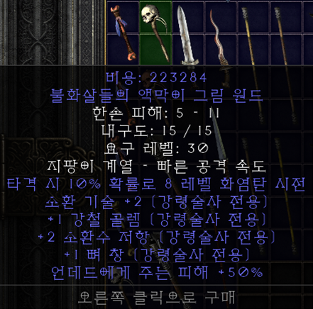 상점표/사냥표 완드 ▼ 영혼/스피리트(룬워드) or 리치원드(유니크) / 본넥 ▼ 화이트(룬워드) / 본넥 or 데쓰웹(유니크) / 독넥 or 오심(룬워드) / 조폭넥 or 야수(룬워드) / 조폭넥 |