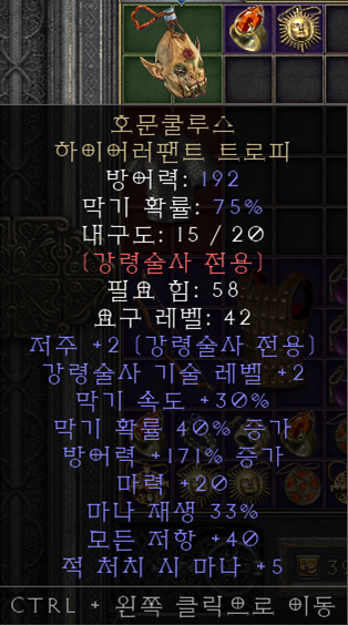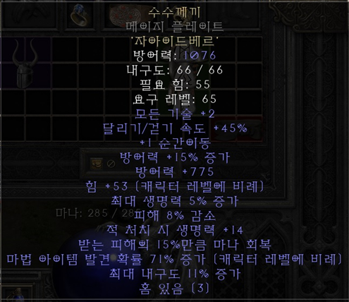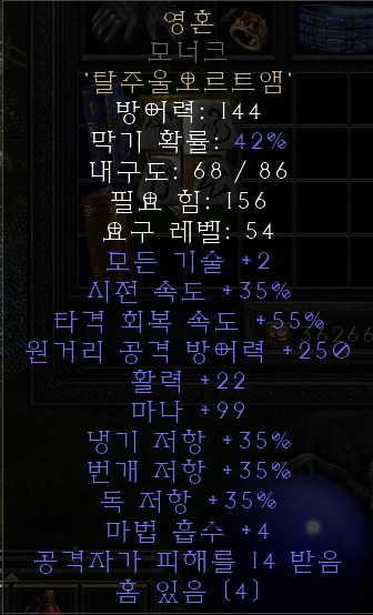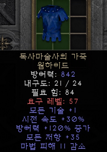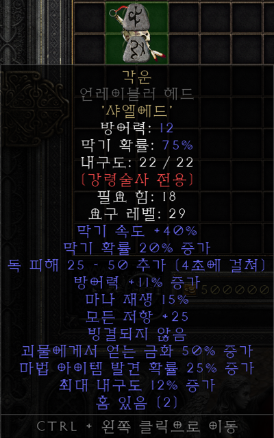 유니크 샤코 최상급 서클릿류 아이템을 고려하지 않는다면 가장 무난하고 최선의 선택이 되는 샤코입니다. 2스킬도 스킬이지만 레벨비례 피통과 피해감소 옵션은 생존력에 큰 도움이 됩니다. 매찬은 더 말할 필요도 없는 좋은 옵션이죠? |