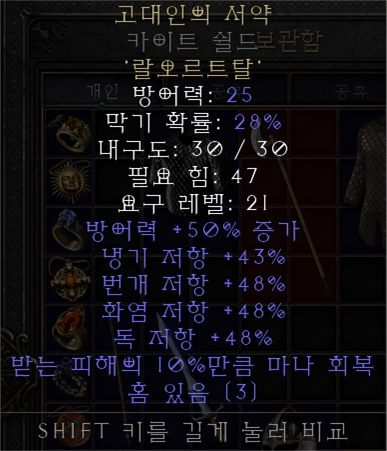 1. 고대인의 서약(Ancient's Pledge) 렙제 : 21 3소켓 방패 / 랄(Ral)+오르트(Ort)+탈(Tal) 초반에 부족한 레지를 캐리해주는 고대인의서약입니다. 3소켓 방패에 다이아를 3개 박아서 올레지를 보충하는 방법도 있기는 하지만, 액트5를 밀다보면 꽁으로 룬세트를 얻을 수 있기 때문에 고대인의서약을 굳이 안만들 이유는 없습니다. 3소켓 방패는 액트2 상점노가다를 통해 쉽게 구할 수 있습니다. 제왕운시를 만들기 전까지 써주면 됩니다. |
