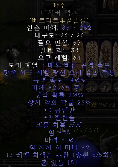 야수(Beast) 렙제 : 63 5소켓 도끼/셉터/망치 베르(Ber)+티르(Tir)+우움(Um)+말(Mal)+룸(Lum) 조폭네크용 졸업무기 중 하나인 야수입니다. 위에서 언급했다시피 오심+호우먼/야수+스피릿의 선택지가 있기 때문에 여유가 있으신 분들은 두 세팅을 모두 해보시고 보다 입맛에 맞는 세팅을 가져가시면 됩니다. 장착 시 9 레벨 광신(파나시티즘) 오라 효과 옵션이 있기 때문에, 소환몹 및 용병의 공격능력을 올리기 위해 사용합니다. 9레벨 광신 오라의 효과는 다음과 같습니다. 데미지 186% 증가 / 공격속도 29% 증가 / 명중률 80% 증가 |