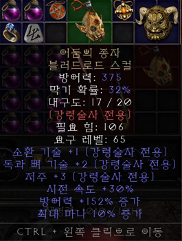 고대인의서약(룬워드) ▼ 제왕운시(룬워드) ▼ 스피리트(룬워드) / 공통 or 호우먼(유니크) / 공통 or 어둠의종자(유니크) / 본넥 or 트랑울방패(세트) / 독넥 |