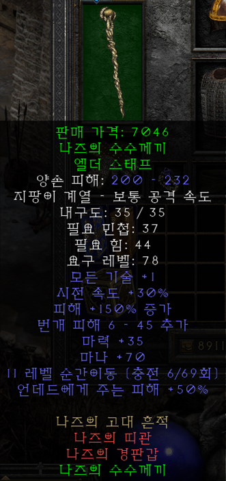 텔포 스테프 수수께끼를 끼기 전까지 사용하게 될 텔포봉입니다. 보통 상점노가다를 통해 텔레포트가 붙은 매직 스테프를 구매해서 스왑용으로 사용하는 것이 일반적이며, 사냥하다가 나즈 스테프트 나온 경우 나즈로 갈아타시면 됩니다. 조폭넥의 경우 타 직업에 비해 텔레포트의 중요도가 매우 높기 때문에 텔포봉은 반드시 하나 구해서 들고다니셔야합니다. |