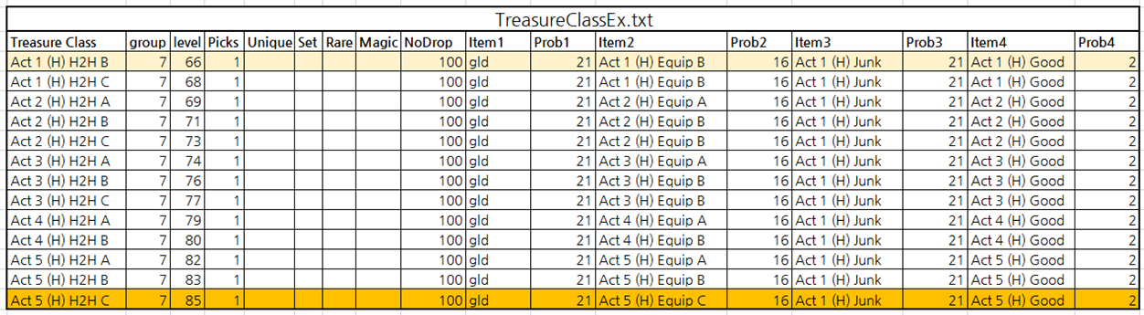 [TreasureClassEx]에서 Act1(H)H2H B를 찾아보니 Act1(H)H2H B는 group=7, TC lvl=66인 것이 확인됩니다.