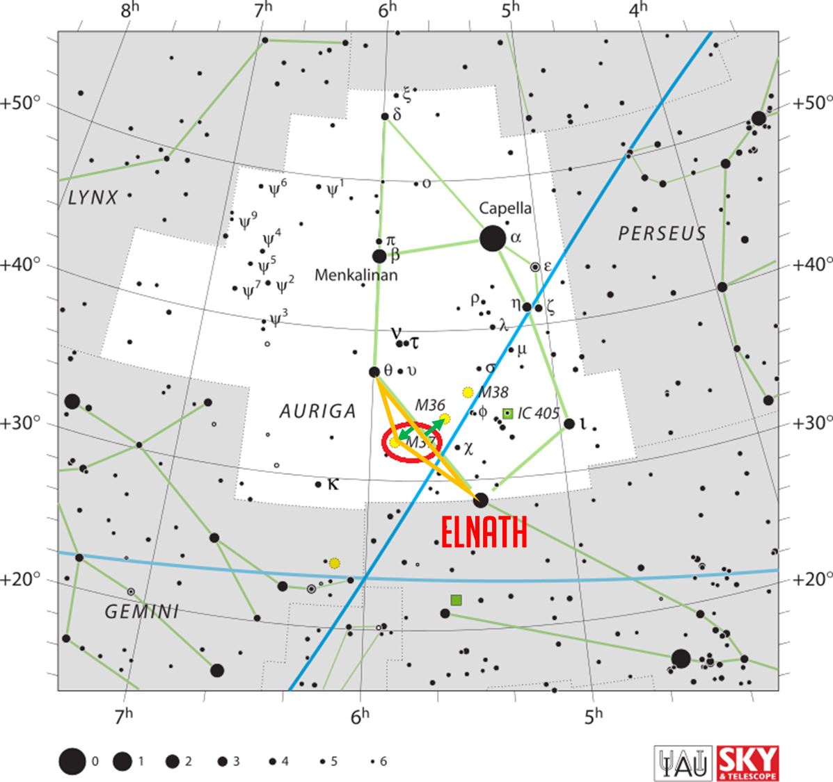 호핑난이도 상 호핑요령 M36과 비슷하게 세타(θ)와 엘나스(Elnath)를 기준으로 삼각형을 그린다고 생각하며 찾되, 꼭지점의 위치가 세타와 엘나스를 이은 직선에서 M36까지 떨어진 만큼 반대쪽으로 떨어져있다고 생각하고 찾았음. 관측기록 대충 위치 잡고 아이피스로만 찾음. 이전 관측에서 몇번 찾다가 실패한 경험이 있어서 좀더 진득하게 앉아서 여러번에 걸쳐 찾는 연습을 시도함. 다섯번 이상 다시 찾는 것에 성공하긴 하였으나 여전히 뭔가 확실한 방법은 찾지 못함. |